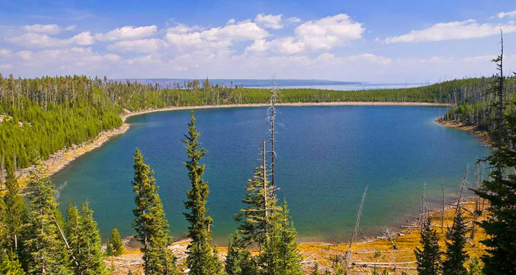 西拇指间歇泉盆地,位于黄石湖边上,十五万年前因地壳陷落而形成,在热喷泉与湖水结合下,出现了一种烟雾弥漫的奇妙景观:烟雾缭绕处是热泉的蒸气,绿波盈盈处是黄石的湖水,与背景中蓝天白云相互辉映,形成与黄石其他温泉区不同的景观。此处相当于黄石湖的湖湾,许多间歇泉聚集此处,喷水口的颜色多种多样,有的呈透明绿色,有的呈好似水泥色般的暗暗的黑色。许许多多的喷水口呈现一种美丽的幻想。