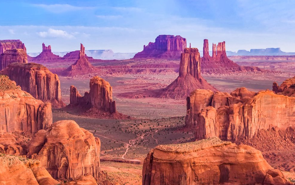 今天我们将前往下羚羊彩穴。途径葛兰峡谷,这里孕育着全美第二大人工湖-包伟湖(车游),它有96个峡谷环绕,仿佛是另一个坐落在湖上的大峡谷。下羚羊彩穴是世界十大著名摄影地点,我们将随着纳瓦霍印第安向导一探他们的保护区。随后前往国家地理杂志评选出的美国十大最佳摄影地点之一的马蹄湾。午餐后前往纪念碑谷,纪念碑谷的壮观难以用言语描述,一尊尊巨大的雕塑矗立在红色的原野上。